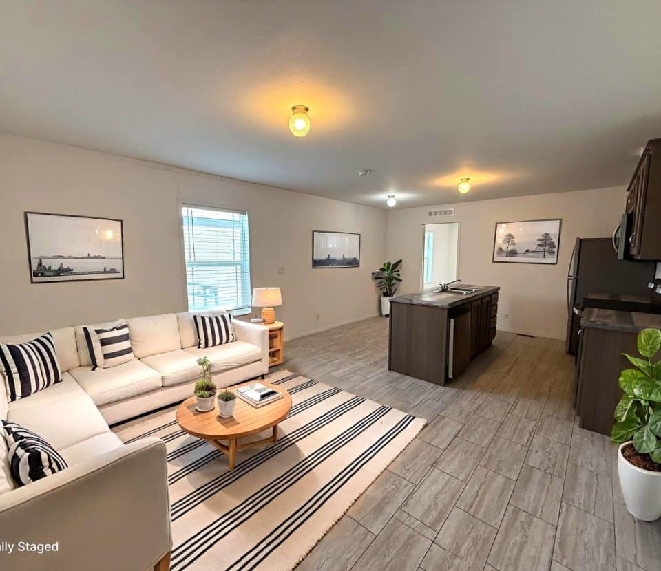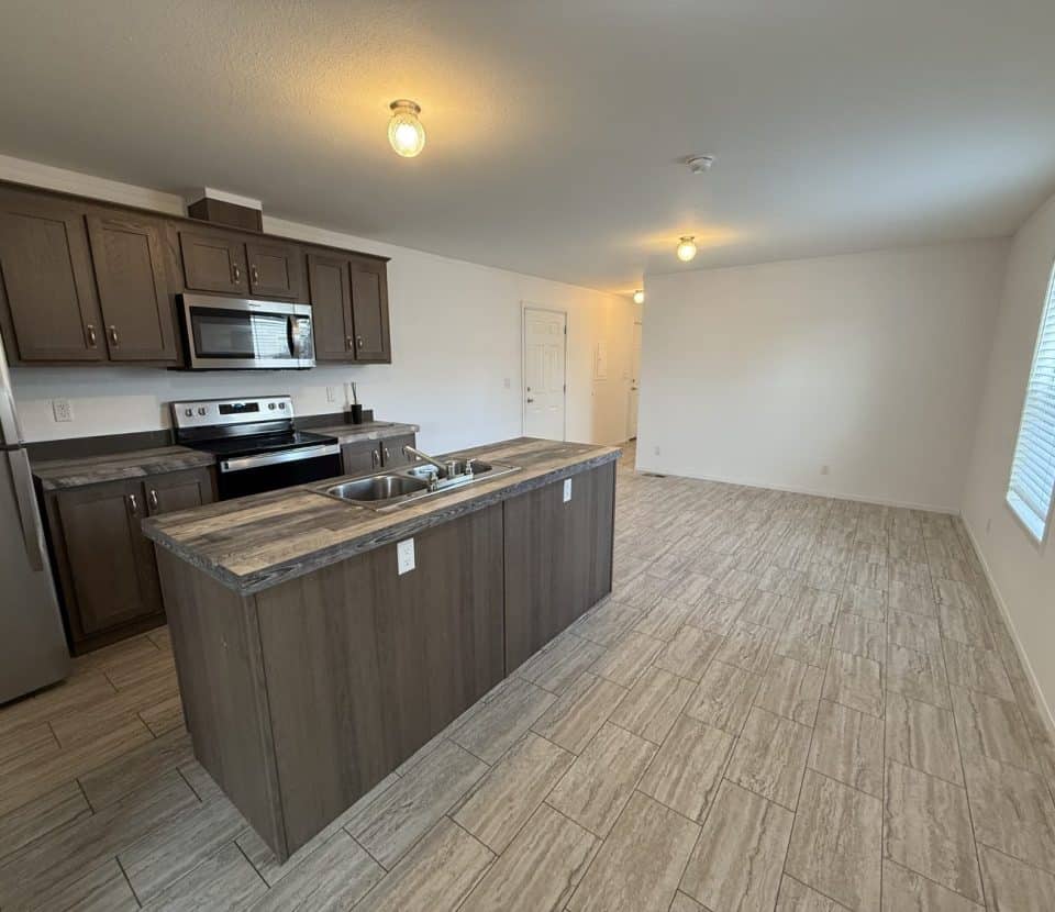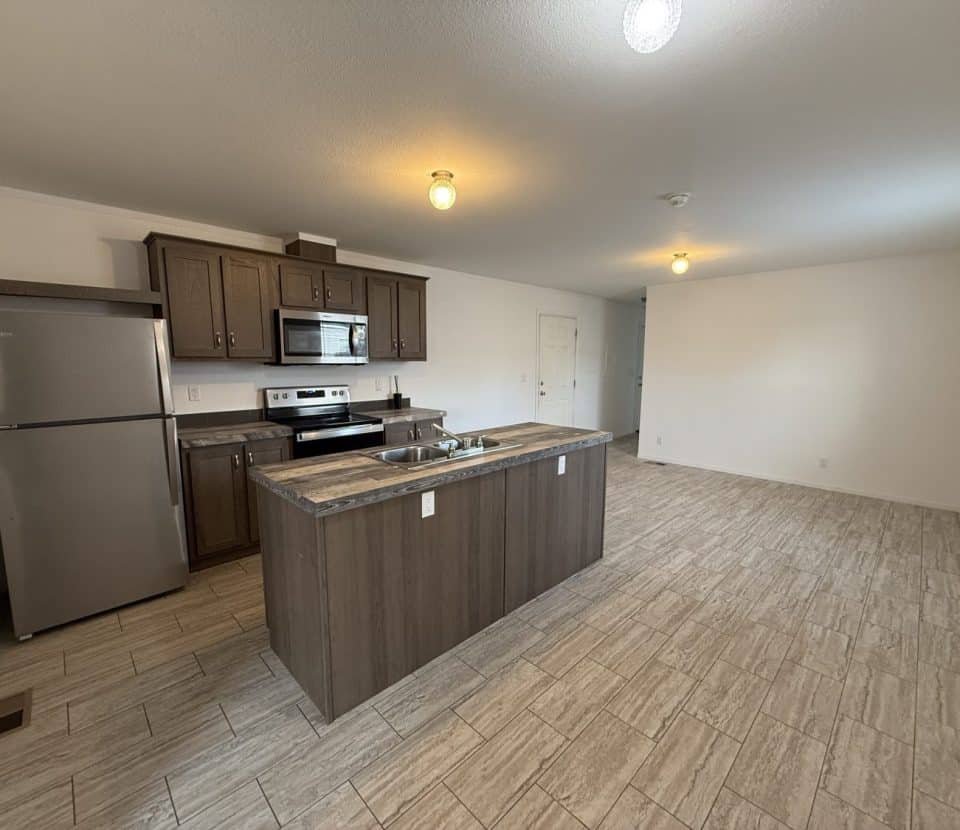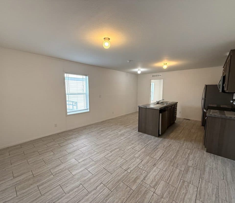 The spacious, open concept layout seamlessly connects the kitchen, dining area, and living room, creating an inviting atmosphere. The kitchen features stainless steel appliances, rich cabinetry, and a large island that provides additional workspace and seating. The tile look flooring throughout the home offers durability, elegance, and easy maintenance!
